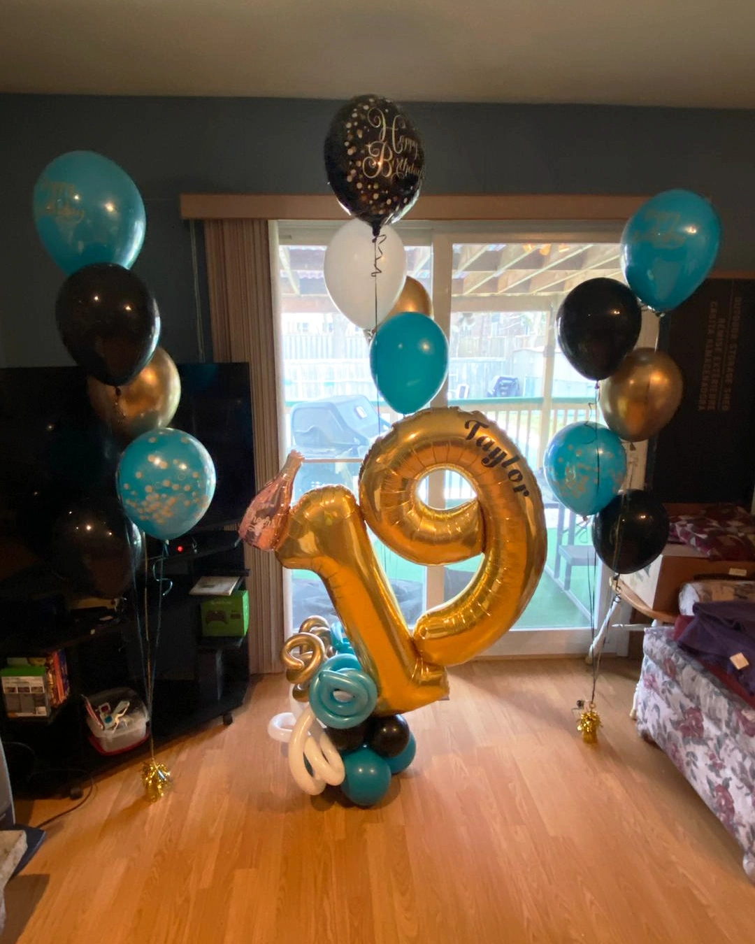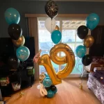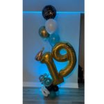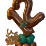 Great for anyone celebrating a birthday. Large foil double digit number sitting on a balloon base with swirl balloon highlights and personalized name on the number.